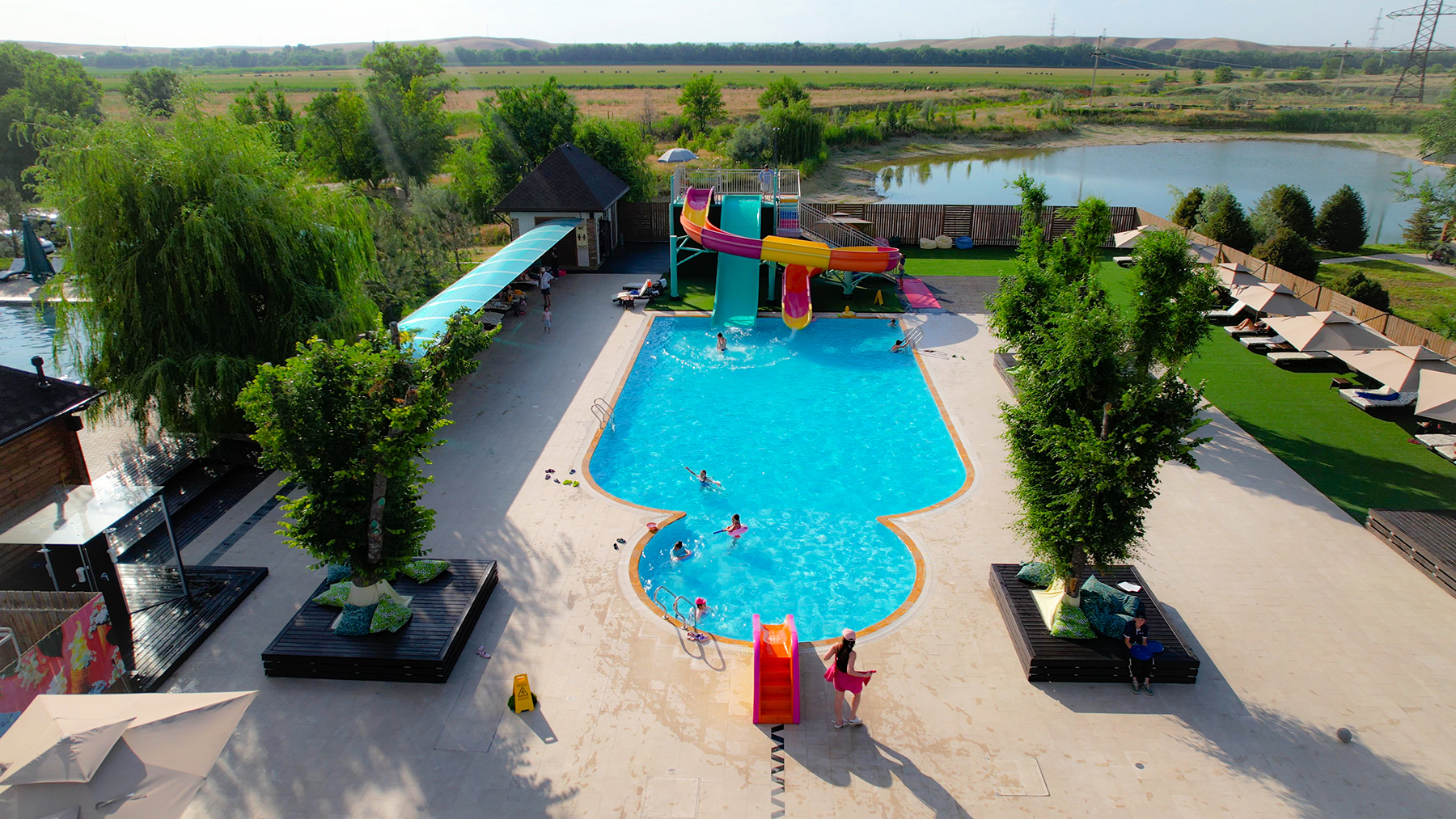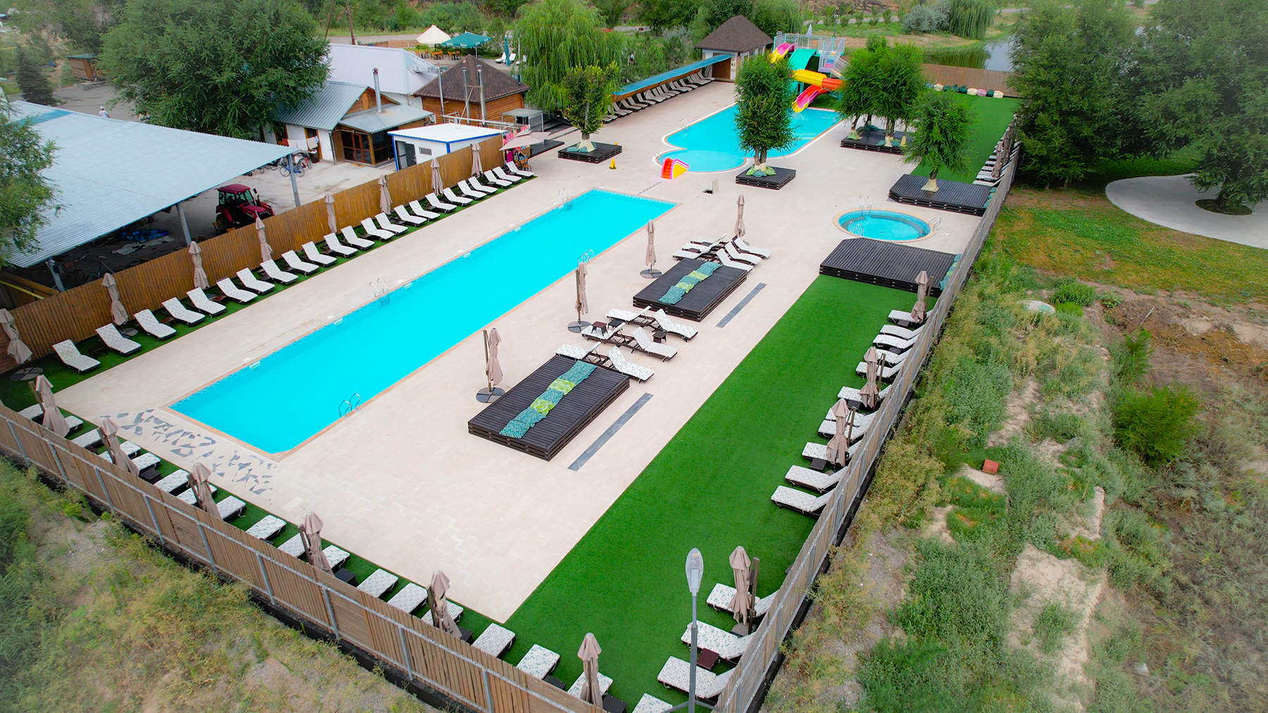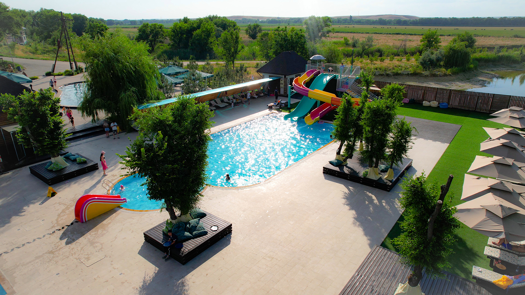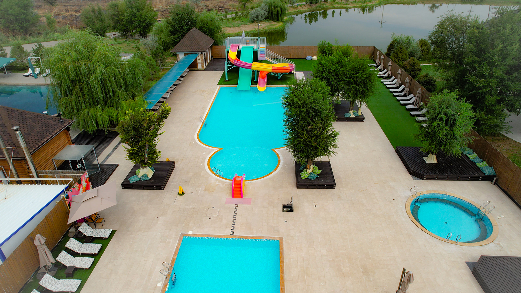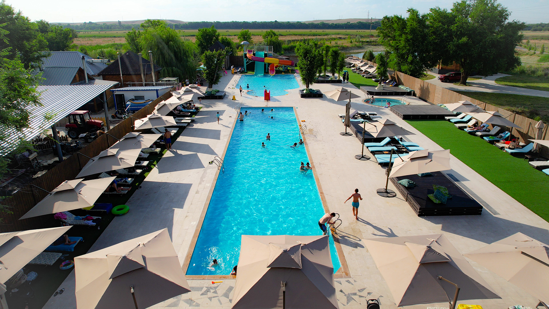 Аквапарк оснащён тремя современными водными горками, чтобы каждый мог найти развлечение по своему вкусу, а также подогреваемыми артезианскими бассейнами и джакузи с системой очистки воды, обеспечивающей максимальную чистоту и комфорт.