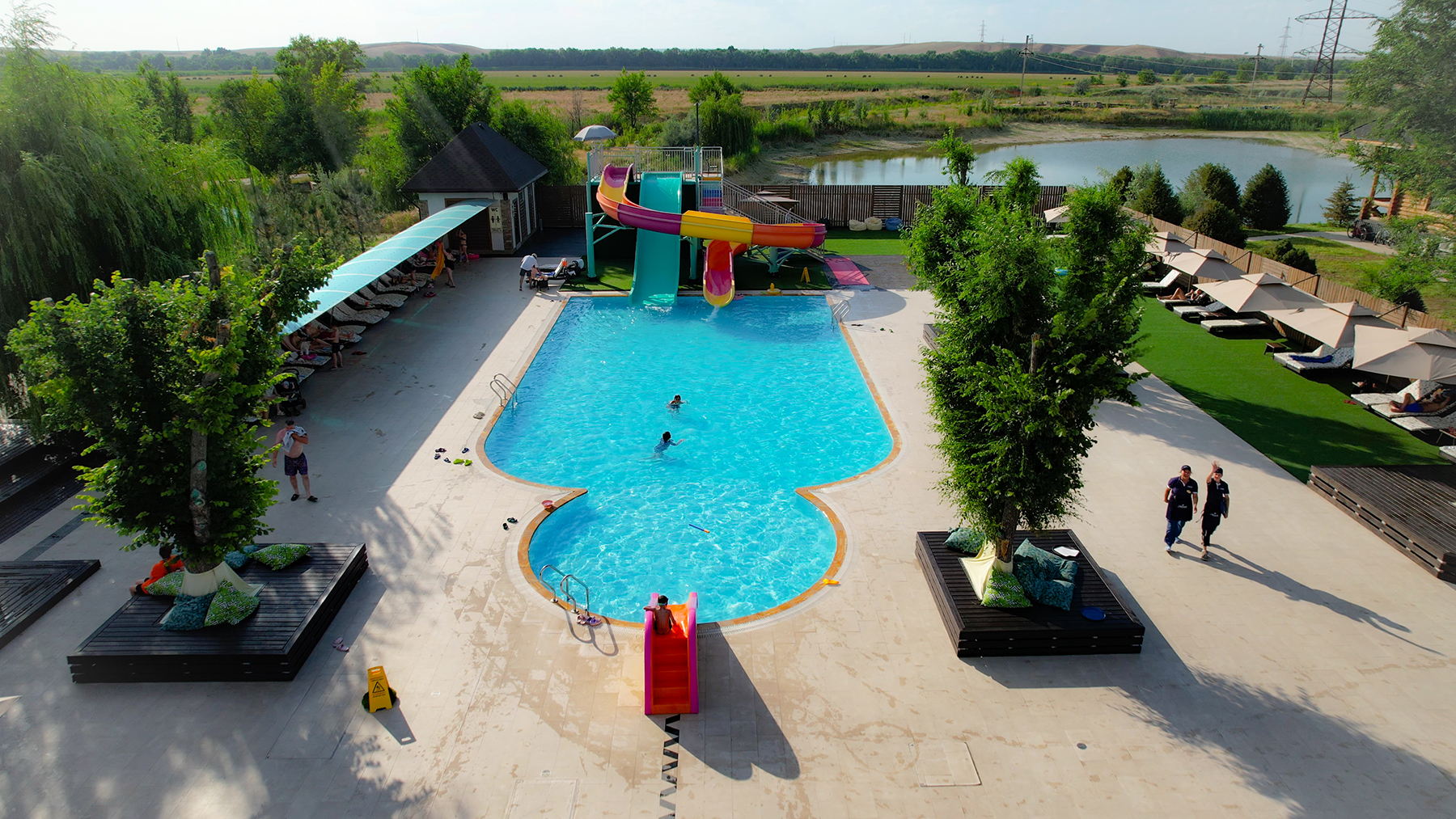 Территория аквапарка вымощена натуральным иранским белым мрамором, который не только выглядит эффектно, но и придаёт пространству изысканность. Для вашего удобства здесь расположены топчаны с мягкими подушками, где можно расслабиться, а также теневые зонты, ротанговые шезлонги и удобные кабины для душа, обеспечивающие комфорт и удобство в течение всего дня.
