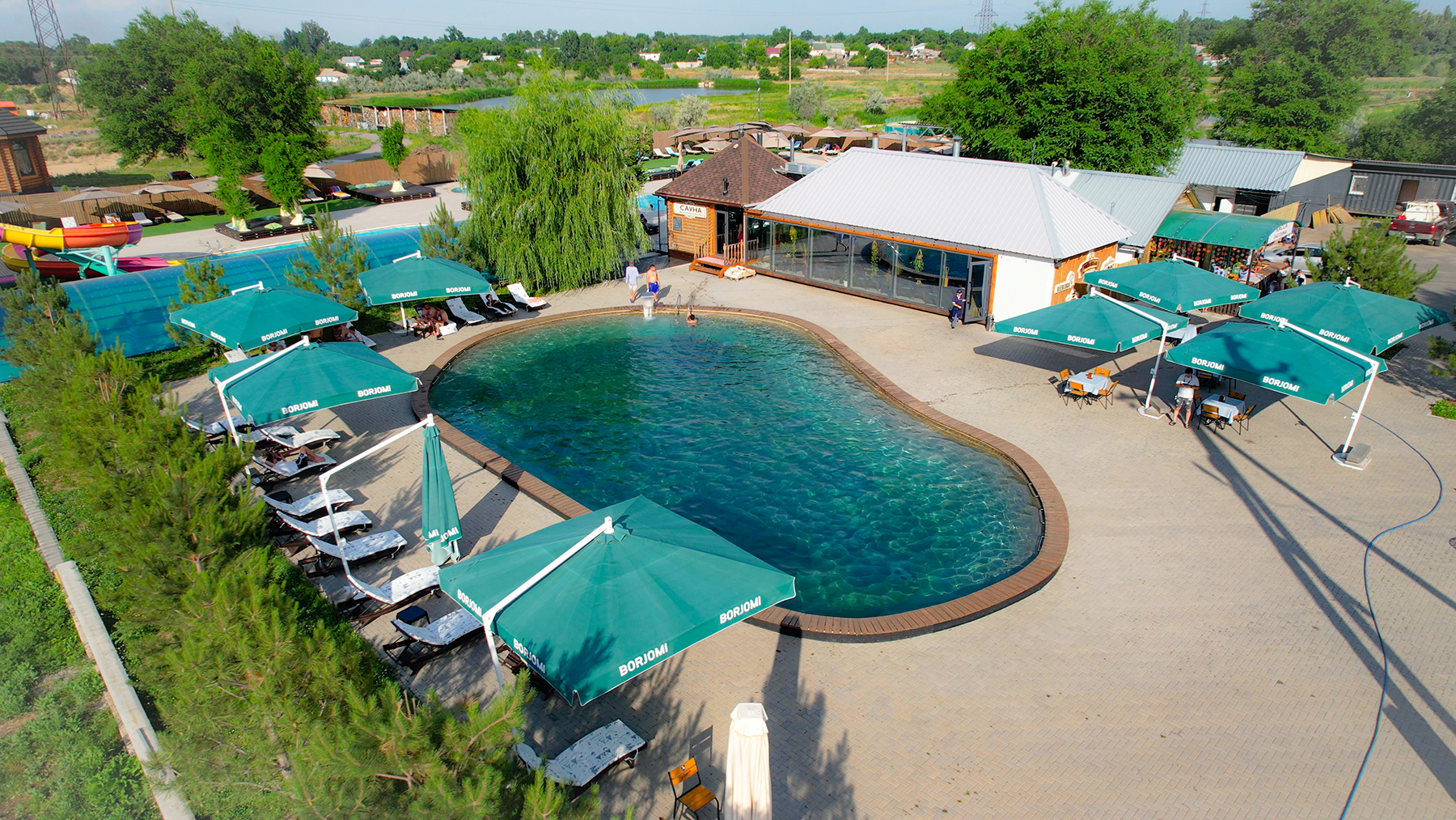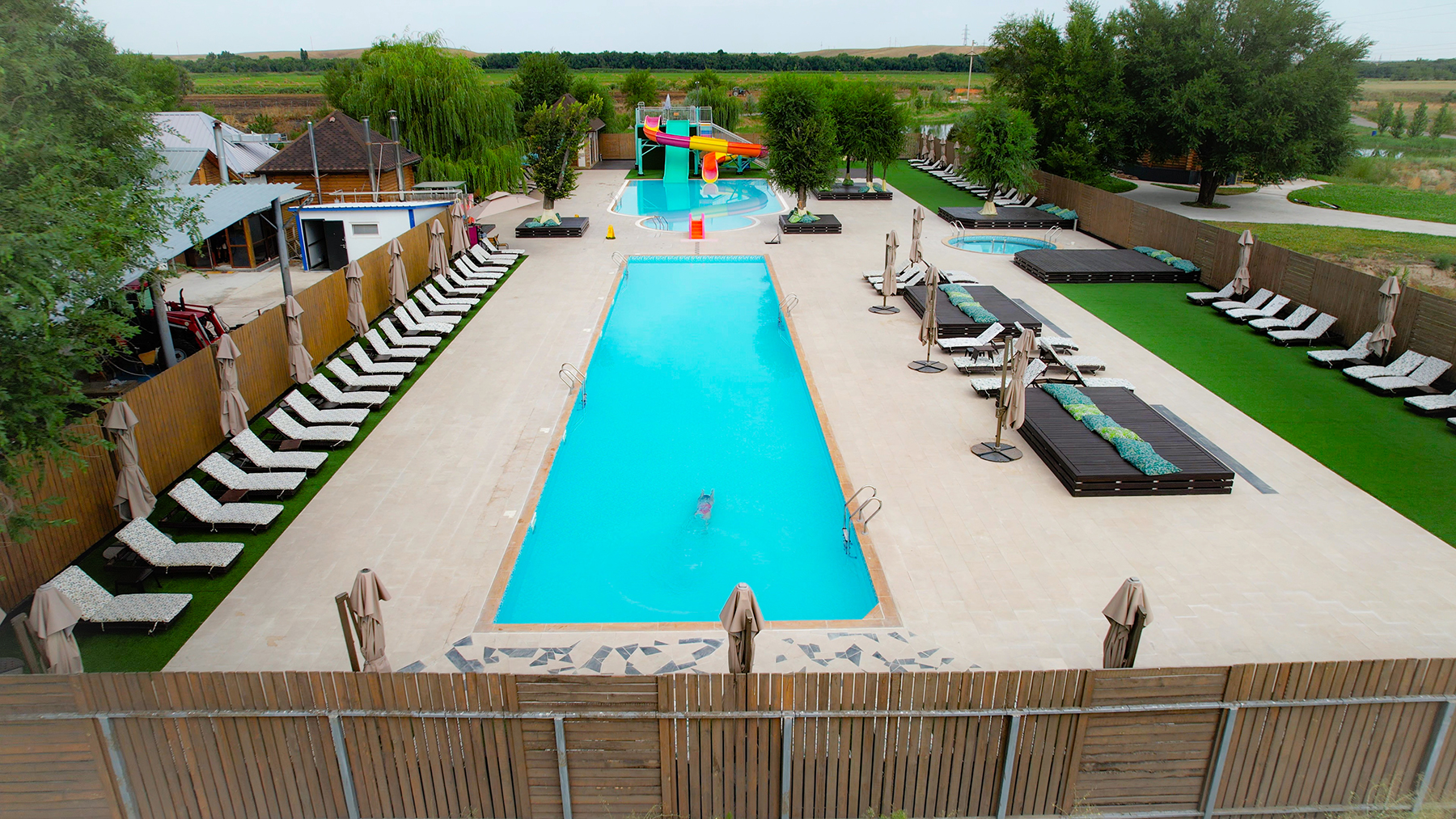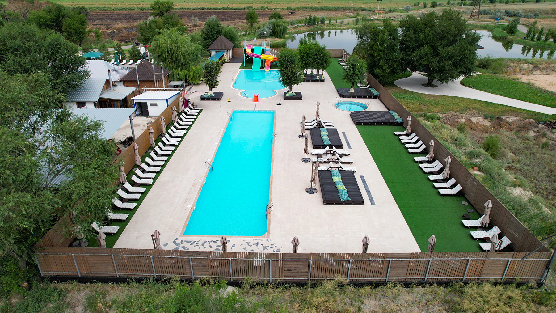 Добро пожаловать в аквапарк на территории Рыбацкой усадьбы — уникальное место, где сливаются отдых, комфорт и радость для всей семьи! Пока мужчины наслаждаются захватывающей рыбалкой, их близкие смогут провести время в зоне релаксации, окружённой природой и свежим воздухом. Наш аквапарк идеально подходит для ограниченного числа гостей, что создаёт атмосферу уединения и максимального комфорта для всех. Для наших маленьких гостей предусмотрены безопасные и увлекательные водные горки, которые доставят массу радости и удовольствия. А для женщин и тех, кто хочет просто расслабиться, предлагаются уютные шезлонги, где можно наслаждаться отдыхом под тенью зонтов, попивая освежающие напитки и слушая фоновую музыку.